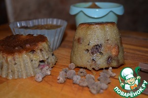Смесь перемешиваем и раскладываем на 3/4 объема в огнеупорные формы, смазанные маслом или маргарином. Если Вы выпекаете пудинг в духовке, то ее предварительно необходимо разогреть до 190град. и выпекать 15-30 мин. (в зависимости от мощности духовки). Моя духовка газовая и старая, поэтому свой румяный пудинг из духовки я ждала 30мин.