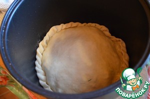 Накрыть вторым кругом теста. Защипнуть красиво (как на чебуреки) края и положить в смазанную растительным маслом мультиварку Vitek VT-4210ВК