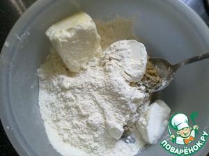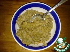 Смесь, сметану, муку, размягченный маргарин соединить, посолить, хорошо перемешать.