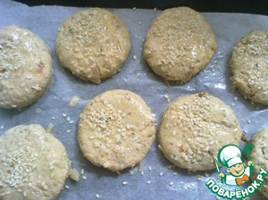 Тесто раскатать в пласт толщиной 1,5 см. Стаканом вырезать кружки. Выложить на смазанный противень. Сверху смазать взбитым яйцом и посыпать кунжутом.