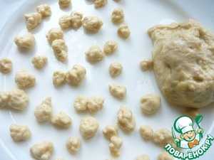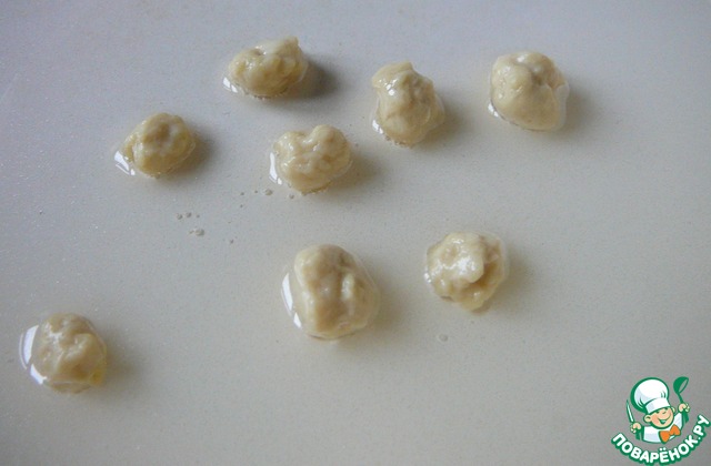 Как я уже говорила, нам нужен "сырой" сейтан. Мы его не варим. Мы его жарим. Делаем малюсенькие заготовки - шарики, размером с ноготь и даже меньше.