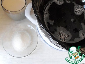 Вводим концентрированное молоко, сахар и ванилин. Масса начинает на глазах увеличиваться в объеме. Как только она станет такой, как на фото - пышной и пенистой, сразу же выливаем ее на пропитанный бисквитный корж. Если немного протянуть время, велика вероятность того, что суфле успеет сильно схватиться, и равномерно распределить его по коржу уже не получится.