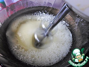 Заранее наливаем в емкость, бОльшую, чем ту, в которой будем взбивать, холодную, почти ледяную воду. Дно чаши для взбивания должно быть погружено в воду, а сама она должна быть устойчиво поставлена, чтобы исключить возможность непредвиденных ситуаций во время взбивания. Кроме того, имейте ввиду, что емкость должна быть очень большой и глубокой - масса должна очень сильно увеличиться в объеме.
