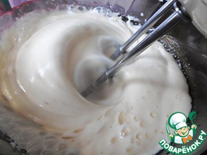 Устанавливаем миску с распущенным желатином на "ледяную баню", взбиваем сироп до пышной белой пены.