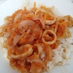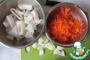 Кальмары нарезаем кольцами, лук режем крупно, морковь натираем.