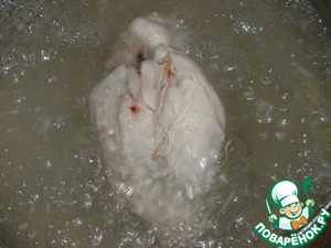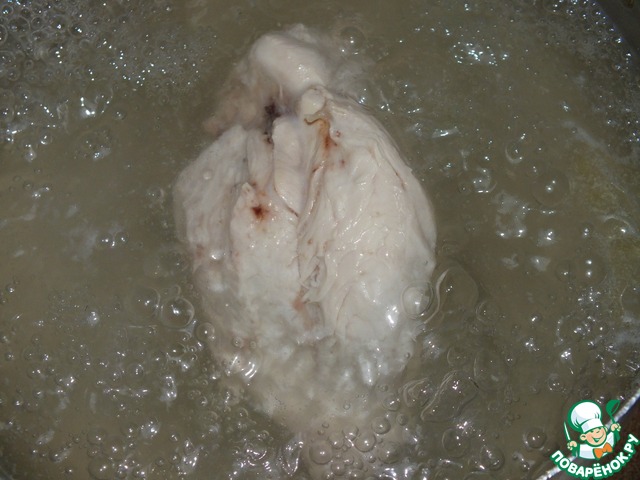 • Куриное мясо отварить в подсоленной воде, остудить (желательно в бульоне).