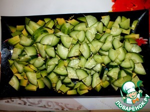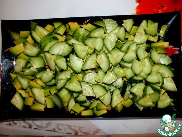 • Огурец помыть, нарезать кубиком. В тарелку выложить авокадо, затем огурец