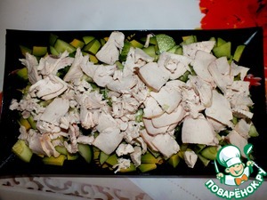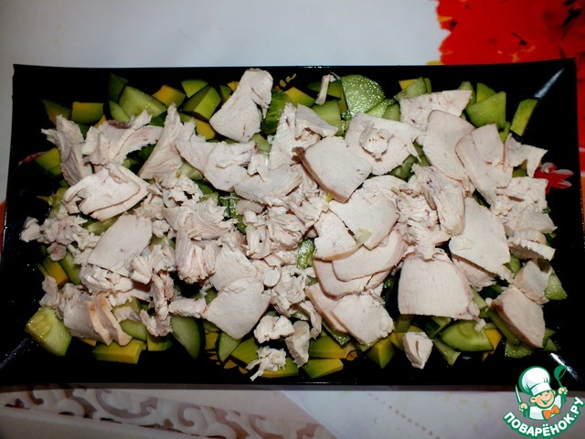 • Куриное мясо нарезать кусочками. Выложить на слой огурца