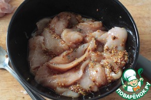 Филе нарезать очень тонкими ломтиками, полить соевым соусом и добавить горчицу. Все перемешать и оставить мариноваться.