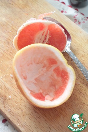 Красный или белый грейпфрут (обязательно сладкий) разрезать пополам и аккуратно вынуть мякоть при помощи ножа и ложки.