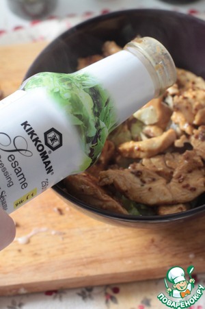 Теплое филе выкладывайте в салат, поливайте соусом Киккоман салатный с кунжутом и перемешивайте. Подавать сразу, пока курица еще теплая.
