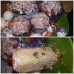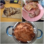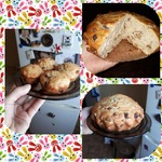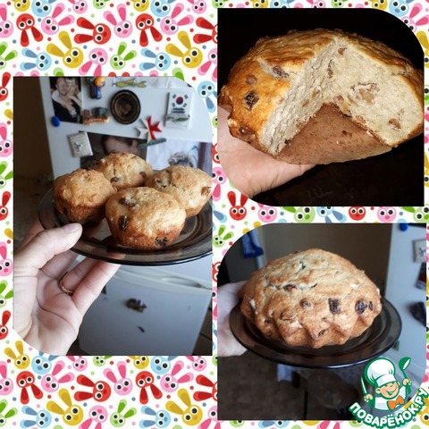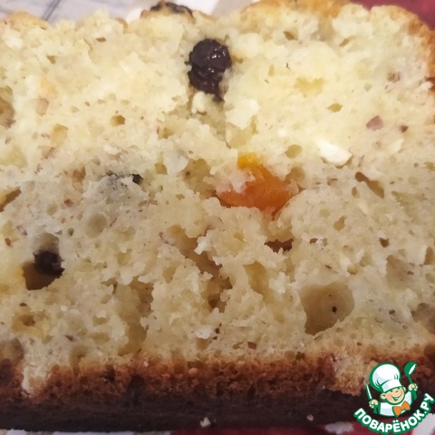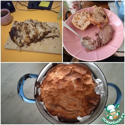 [+4]Сразу скажу, что готовила в целом и общем по рецепту, но так как я стараюсь питаться правильно (ну хотя бы относительно правильно), то вместо сахара положила сахзам (кажется, 3 или 4 стакана), а вместо пшеничной пуки использовала ржаную. И творог не перетирала (но у меня без комочков изначально). И так как у нас в городе не продают специальных форм, то часть теста я залила в две небольшие (примерно 400 мл) кружки, а части - в кастрюльки (обе примерно по 13-15 см в диаметре). Начинка: три вида изюма + горсточка грецких орехов.