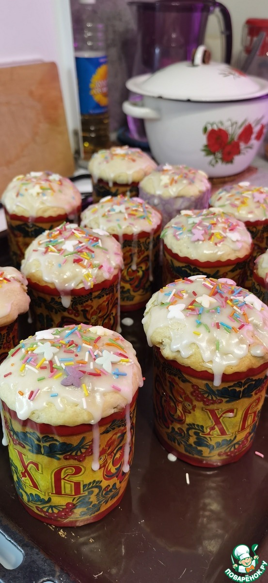 Хочу с вами поделиться рецептом очень простых и невероятно вкусных куличей. Он для тех, у кого нет времени или возможности возиться с дрожжевым тестом. Этот рецепт переходит из рук в руки с невероятной скоростью. Мне дала его кума, а у меня его попросили все мои и мамины подруги. Я каждый год экспериментирую с новыми рецептами дрожжевых куличей, но и постоянно неизменно пеку еще и эти. Так как в нашей семье они расходятся самыми первыми.