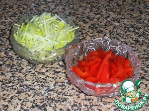 Перец освободить от семян и нарезать тонкой соломкой.