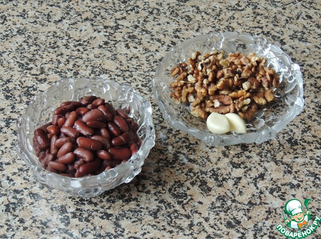 Орехи измельчить. Фасоль пюрировать с помощью блендера. Соединить оба компонента, добавить растертый чеснок.
