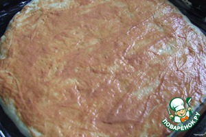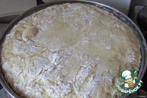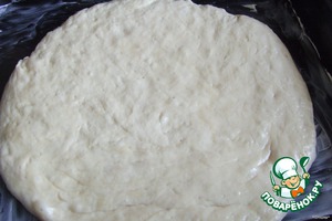 Тесто разделить на две части, скать в шары, раскатать их в круглые лепешки и выложить на противень.