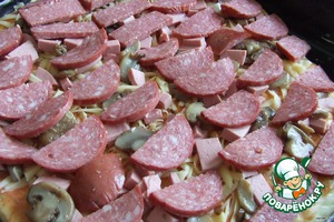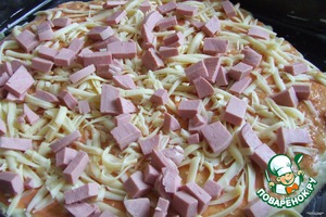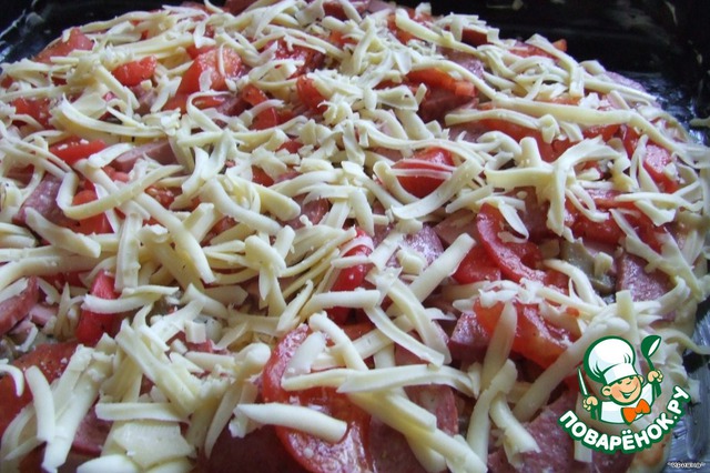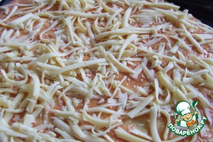 И остальную часть сыра. Пиццу поставить в духовку примерно на 20-30 минут. Выпекать при температуре 200 градусов. До золотистого цвета.