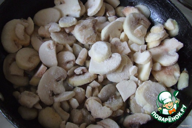 Грибы( я брала шампиньоны замороженные, так как свежих не было) обжарить на растительном масле. В самом конце посолить по вкусу.