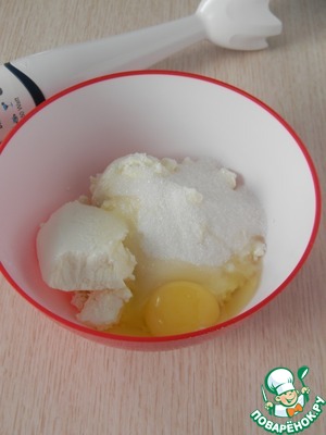 Для творожного слоя в миске смешать творог, яйцо, сахар, сыр (можно взять полностью творог) и муку.