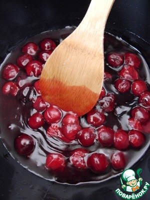 Когда сахар растворится, крахмал развести в 1 ст. л воды, добавить в вишню. Проварить пока не загустеет, это происходит быстро.
