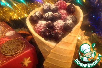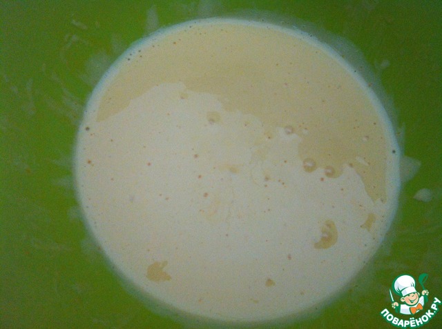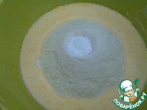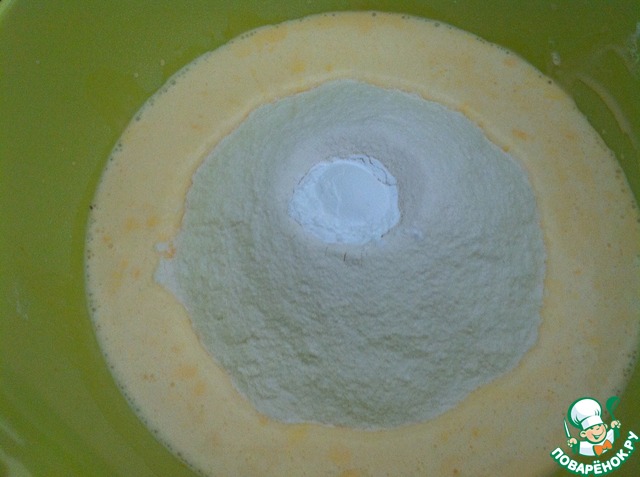 Просеять в полученную массу муку и разрыхлитель (на фото выложила так для наглядности) и перемешать лопаткой (если миксером, то вафли будут " резиновыми")