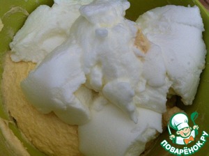 Влить охлажденное растопленное масло и коньяк, перемешать. Аккуратно вмешать взбитые белки.