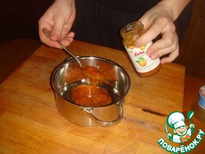 Как только желатин растворится, вливаем его тонкой струйкой в абрикосовую основу, которая у вас греется на плите. Хорошенько её размешиваем и снимаем с плиты.