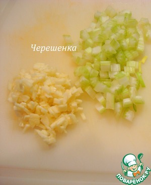 Чеснок измельчить. Сельдерей порезать кубиками.