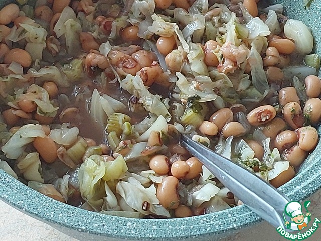 Добавить фасоль вместе с отваром, в котором она варилась. Посолить и довести до кипения, варить 3 минуты. Дать настояться минут 10-15.