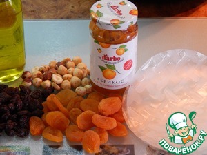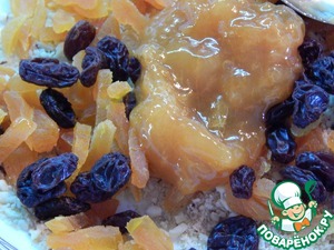 Добавляем измельченную курагу, изюм, конфитюр. Все перемешиваем.
