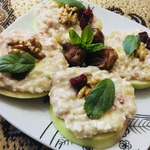 Яблоки нарезаем кружочками, приблизительно 0,5-0,7см. Середину убираем. Намазываем нашим кремом и украшаем. Наше супер полезное "пирожное" готово, можно лакомиться.