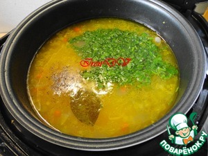 За 10 минут до окончания режима кладем лавровый лист, специи и зелень. Корректируем соль.