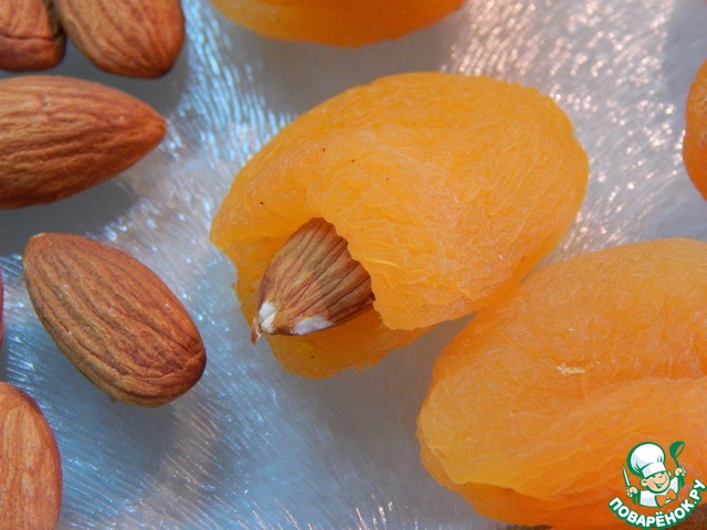 Тем временем начиняем подготовленные абрикосы миндалем.