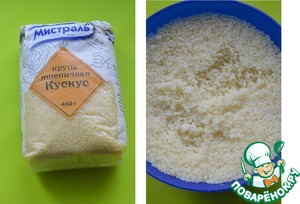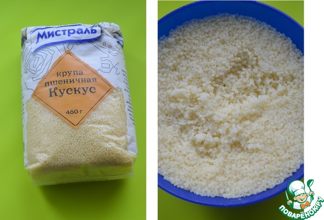 Кускус залейте горячей водой, накройте крышкой и дайте настояться 5 мин.