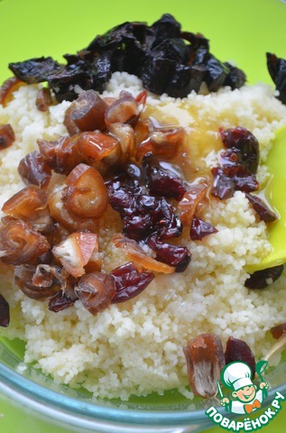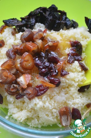 Смешайте кускус с измельченным черносливом, финиками, клюквой, добавьте по вкусу мак и мед
