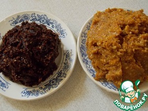 Прокрутить в мясорубке сначала смесь из изюма, кураги инжира и апельсина. Затем чернослив и финики без косточек. Миндаль прокрутить в крошку и в каждую смесь добавить по половине массы. В темную массу положить 2 ст. л. конфитюра. Перемешать.