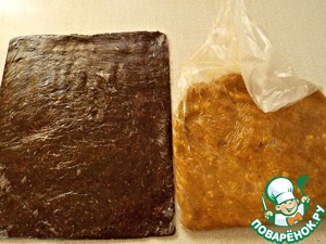 Положить на доску и убрать на 30 мин в холодильник или на 5-10 мин. в морозилку. Затем вынимаем, при помощи кухонных ножниц освобождаем одну сторону пластов. При помощи пленки желтый слой укладываем на верх темного. По краю кладем полосу из конфитюра.