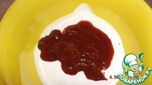 А пока курица обжаривается, приготовим соус. Сметану смешивает с вашим любимым кетчупом.