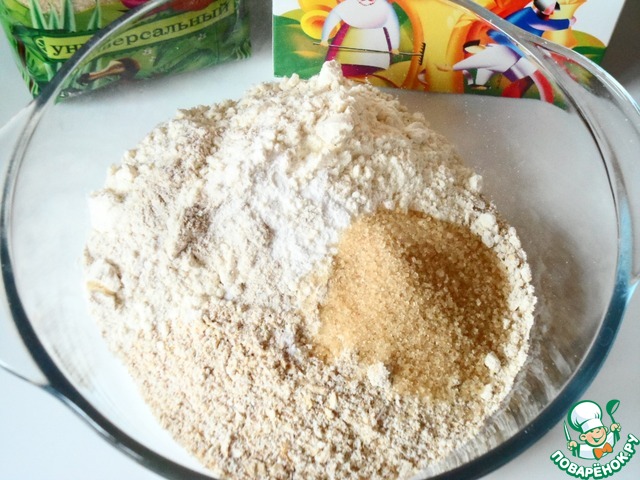 Смешайте его с сахаром, мукой, разрыхлителем. -
