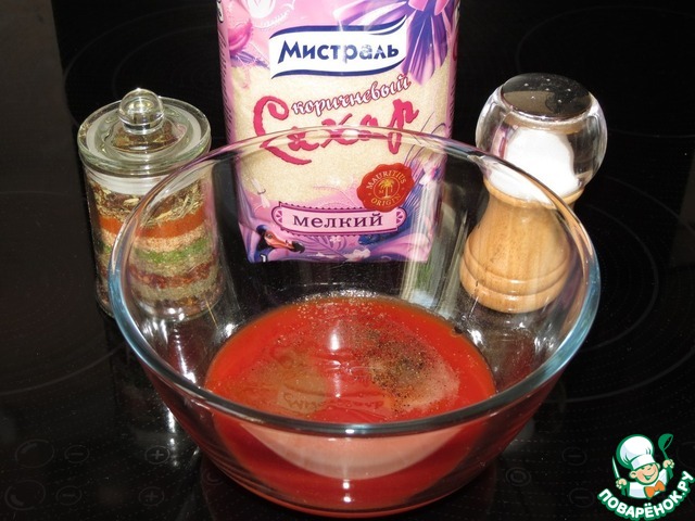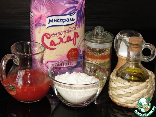 Нам понадобится: Томатный сок, сахар, подсолнечное масло, мука, соль, перец, разрыхлитель.