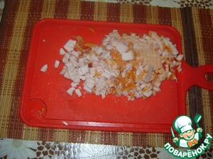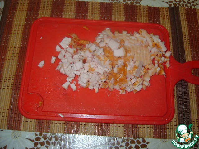-грудка куриная копчёная, лучше маленькая-1 штука. Так как у меня была грудка, как от коня, то я использовала половину:))Можно заменить на копчёное куриное карпачо, но оно мне кажется жестковато для этого блюда...