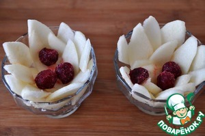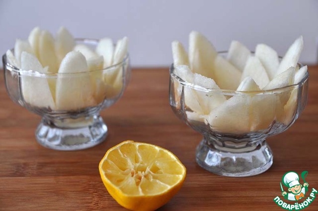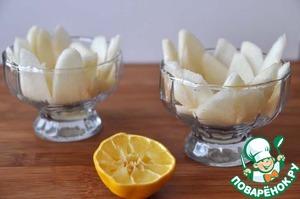 Для порционной подачи берём бокалы или креманницы, укладываем в них груши и поливаем соком лимона.