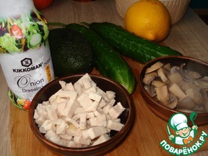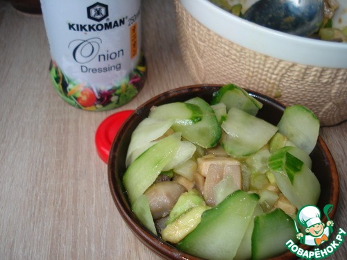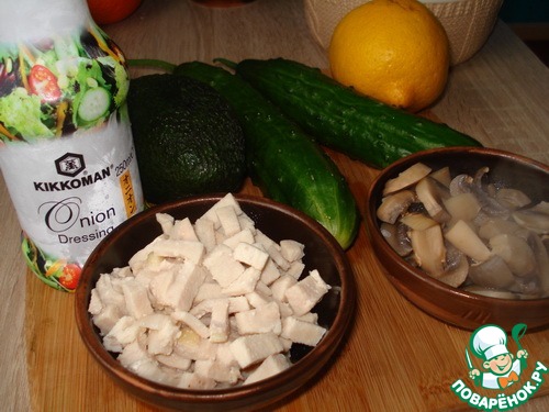 Хрустящий огурчик очень хорошо сочетается с нежной мякотью авокадо, курочка с грибами добавляет сытости, а пряный вкус натурально сваренного соевого соуса Kikkoman и мягкого лукового аромата удачно подчёркивает вкусовую гамму блюда, придавая ему тонкую примесь кислинки и в то же время дарит немного сладкого аромата.