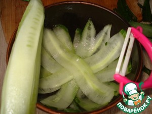 Можно все просто покрошить, но я подавала в небольших куполах из огурца. С помощью овощечистки снимаем «ленточки» с огурца. Когда дойдем до семян, переворачиваем огурец и снова снимаем «ленточки». Миску смазываем растительным маслом. Выкладываем в нее огуречные «ленточки». Оставшийся огурец нарезаем кубиками.