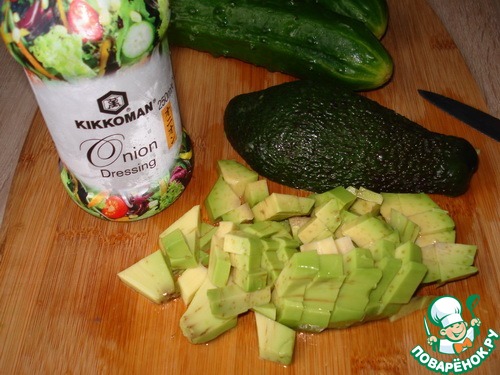 Авокадо очищаем, убираем косточку и нарезаем, сбрызгиваем лимонным соком.