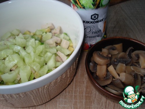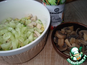 Курица и грибы были отварены и нарезаны.