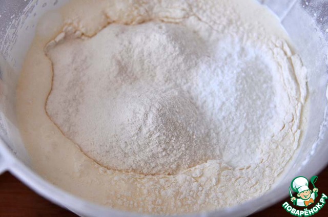 Добавляем просеянную муку, разрыхлитель, перемешиваем. Можно пройти на малых оборотах миксера.