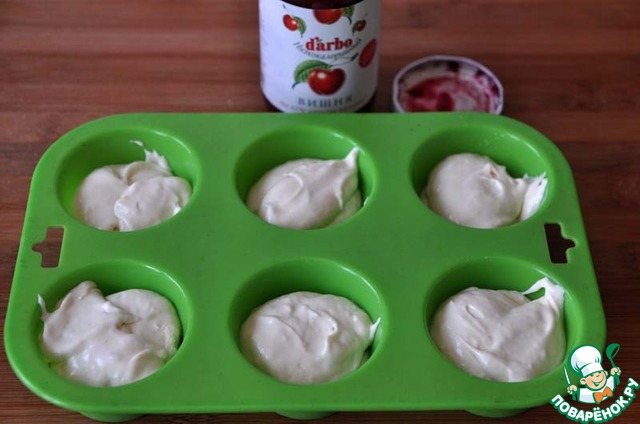 Берём формочки, лучше силиконовые, их даже не надо смазывать. Накладываем по полной ложке теста.