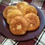 Каждый шарик расплющить в лепешку. На середину каждой лепешки выложить по 45 г начинки (по рецептуре предлагается 48 г).