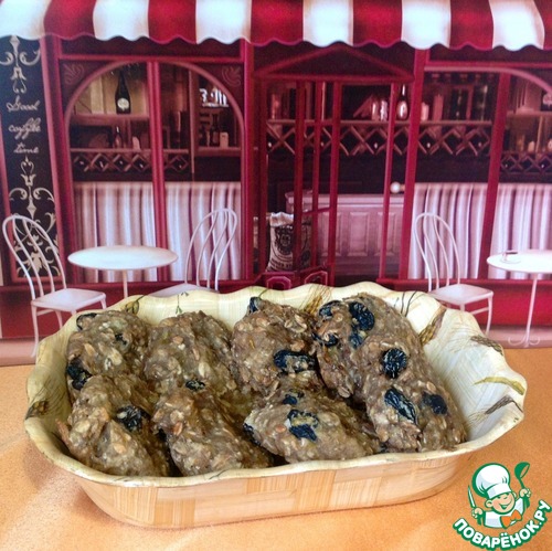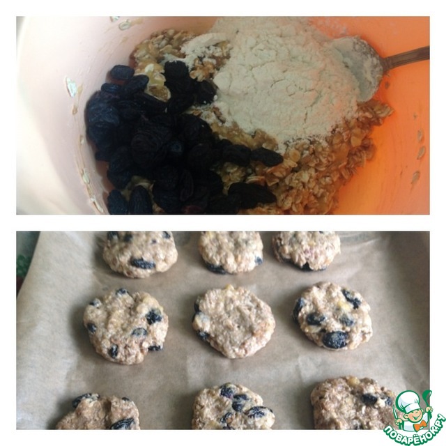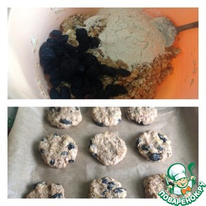 Добавить распареный изюм ( залить кипятком заранее минут на 20, отцедить воду), и муку. Хорошо перемешать и отправить тесто в холодильник на 2 часа. Противень выстелить пекарской бумагой, из теста скатать шарики и слегка их приплюснуть ложкой. Выпекать 15 мин при 180 гр